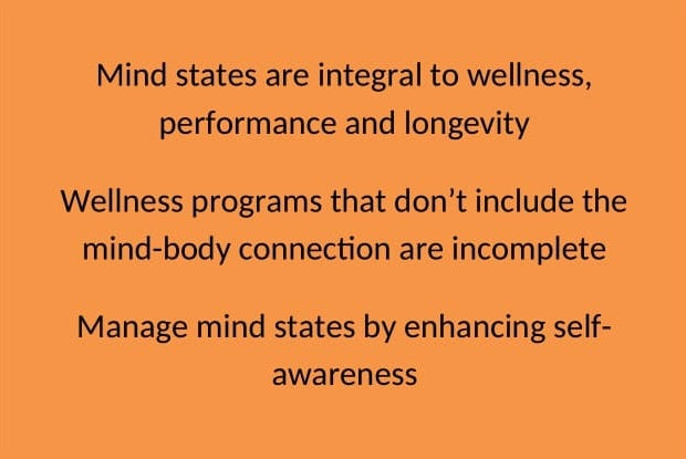 One of the most important paradigm shifts that’s occurred in our time has been the validation of the influence of mind states on immune function. Mind states have been distilled into wellness, performance and longevity enhancing on the one hand versus negative states on the other, which predispose to illness and death.